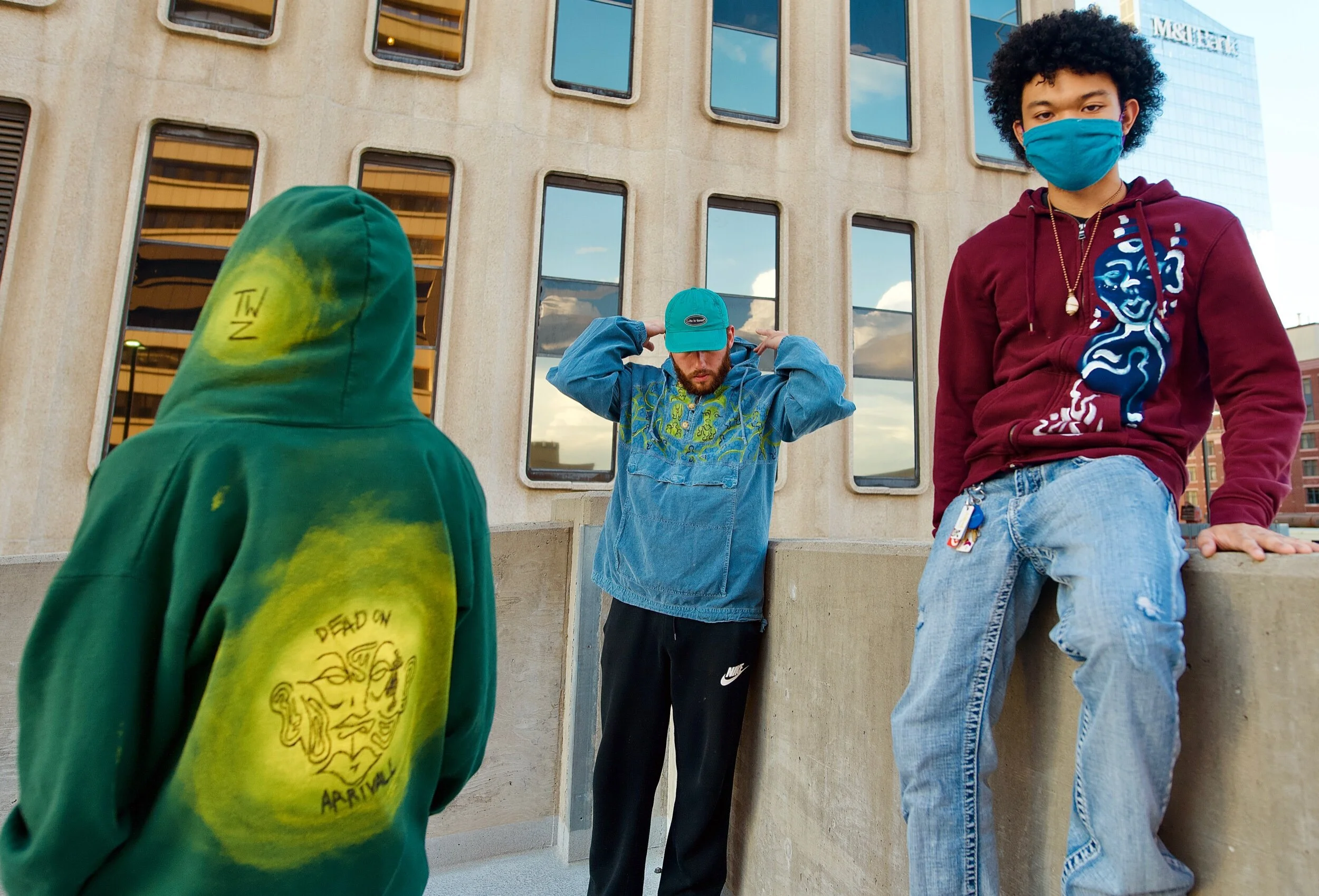 A person wearing a burgundy hoodie with a blue and white abstract face design, blue jeans, and a blue face mask sitting outdoors in an urban area with buildings and a blue sky in the background.